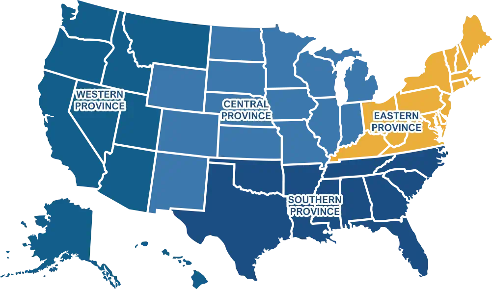 The Lay Dominicans are divided into four provinces within the United States. Which province you belong to is determined by where you live, as membership within a community is local. The Province of St. Joseph comprises the north-eastern United States, highlighted in yellow below. You can click the “Fraternity Finder” button under the map to locate a group within our province, or connect with our brothers and sisters around the country: