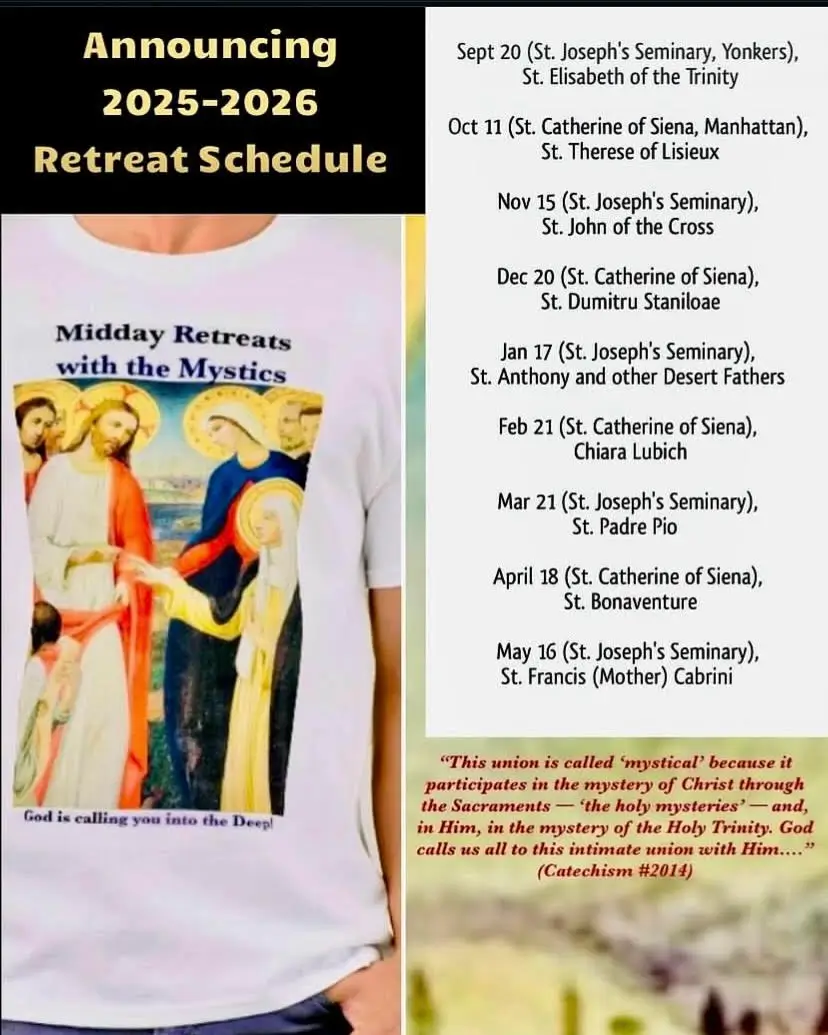 Our October 11 Midday Retreat will be at St. Catherine of Siena in Manhattan, featuring St. Thérèse of Lisieux, continuing the graces of the August 1–3 Contemplative Symposium. If you missed it—or want to revisit talks—recordings are here.